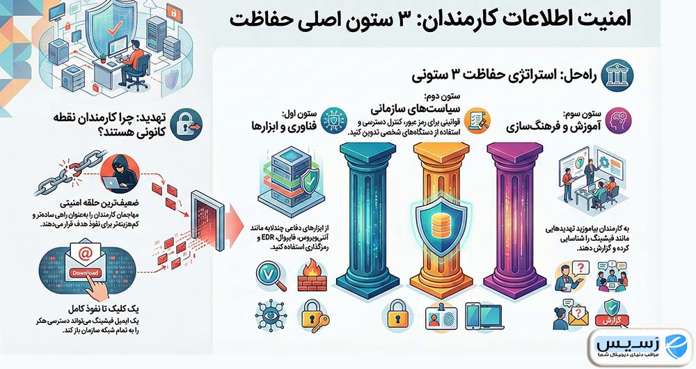 اطلاعات کارمندان دروازه ورود به قلب سازمان است. حفاظت از این اطلاعات تنها به نصب یک نرمافزار امنیتی خلاصه نمیشود؛ بلکه نیازمند یک استراتژی جامع است که سه عنصر اصلی را پوشش دهد: ابزارهای امنیتی، سیاستهای سازمانی و آموزش مداوم.